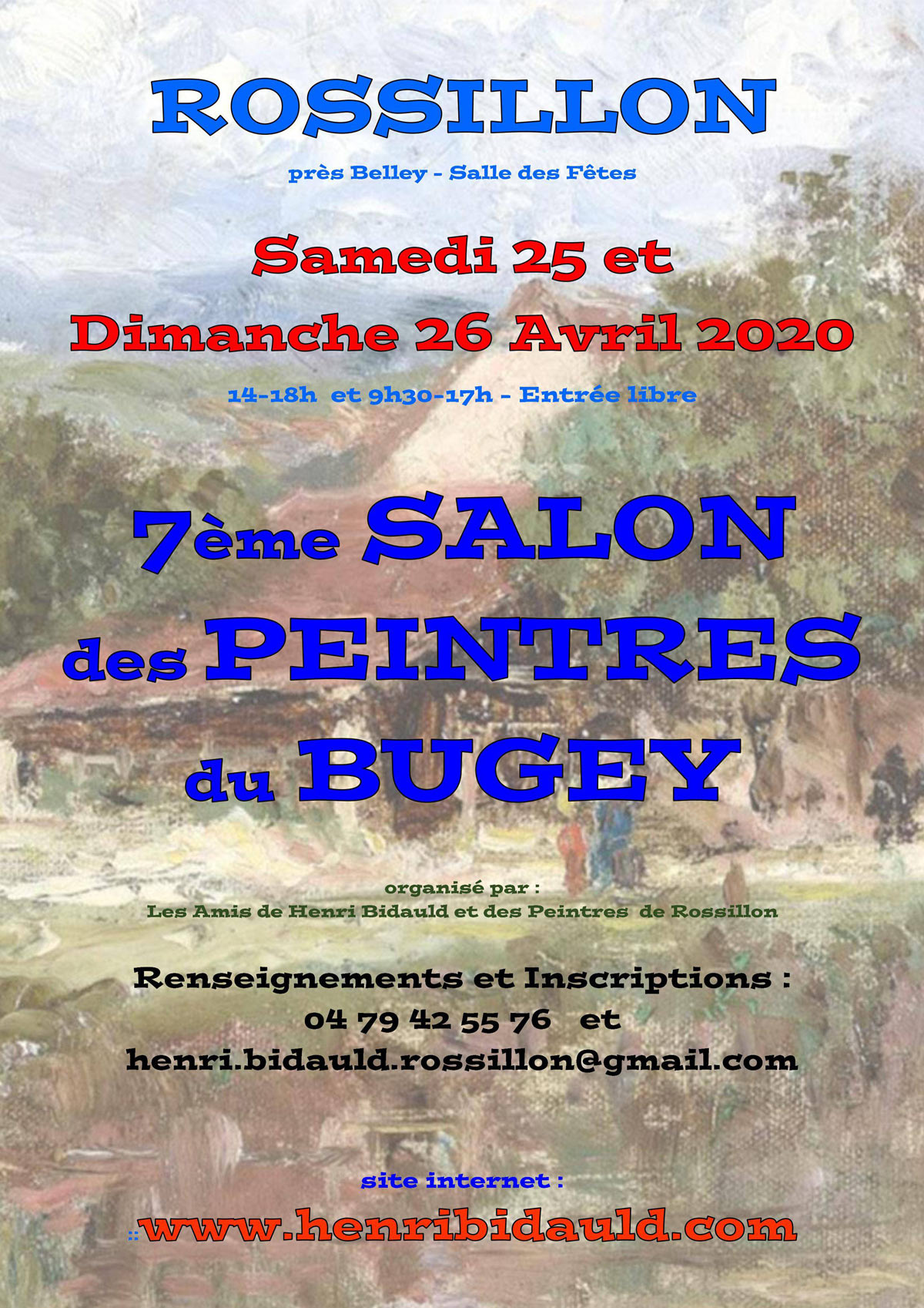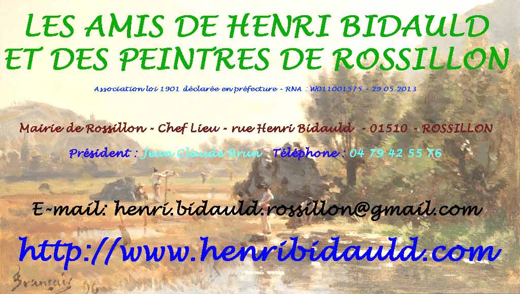 Notre association a pour objet d'organiser toutes manifestations culturelles, recherches et échanges sur la peinture afin de réhabiliter la commune de ROSSILLON (Ain) comme Village de Peintres important à l'instar de BARBIZON et de faire revivre la mémoire de Henri BIDAULD, peintre de ROSSILLON et des anciens grands peintres qui ont fréquenté le BUGEY.