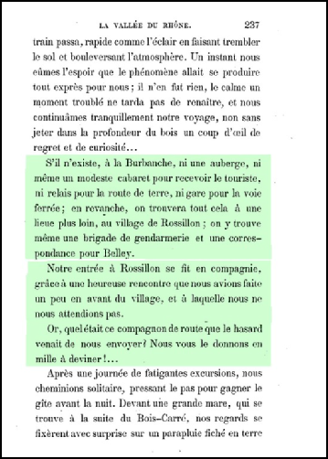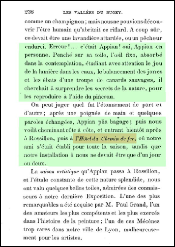 On y apprend ainsi que la halte "obligée" à Rossillon c'est l'Hotel du Chemin de Fer ou il descend