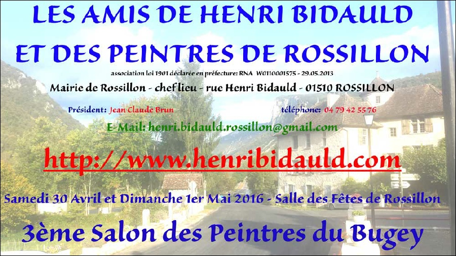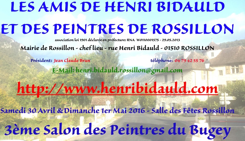 Notre association a pour objet d'organiser toutes manifestations culturelles, recherches et échanges sur la peinture afin de réhabiliter la commune de ROSSILLON (Ain) comme Village de Peintres important à l'instar de BARBIZON et de faire revivre la mémoire de Henri BIDAULD, peintre de ROSSILLON et des anciens grands peintres qui ont fréquenté le BUGEY.