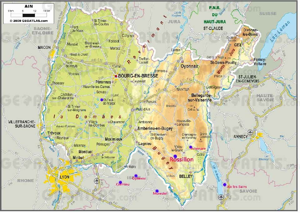 le Pays de Gex au Nord-Est, la Bresse et le Revermont au Nord et les Dombes au Nord-Ouest.